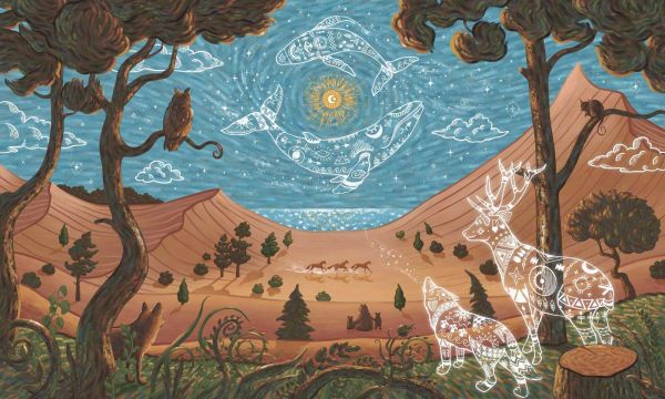 Fantastyczny i nastrojowy krajobraz z ciepłymi odcieniami piasku, głębokim niebieskim niebem gwiazd i subtelnie zdobionymi zwierzętami. Projekt emanuje spokojem, zachwytem i naturalną magią.