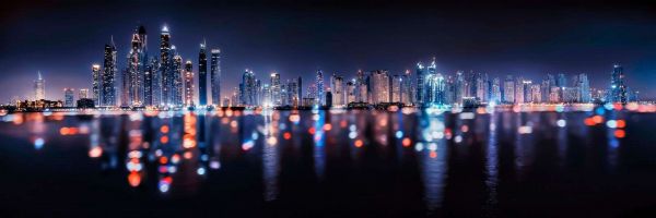 Ta wizualna kompozycja oddaje istotę hipernowoczesnego światowego miasta nocą. Na horyzoncie dominuje błyszczące drapacze chmur o różnorodnych kształtach i wysokościach, oświetlone tysiącami punktów świetlnych w chłodnych neonowo-niebieskich, fioletowych i białych odcieniach. Odbicia w wodzie tworzą niemal surrealistyczną atmosferę, jakby miasto rozciągało się aż do głębi obrazu. Ta kombinacja kolorów składa się z chłodnych odcieni błękitu i fioletu, przeplatanych ciepłymi refleksami światła w pomarańczowym i czerwonym. Ta kombinacja nadaje dynamiczne, energetyczne i nowoczesne wrażenie. Zamglenia światła na pierwszym planie nadają obrazowi artystyczny charakter, sprawiając wrażenie, że patrzysz na skyline przez soczewkę z miękkim ostrzeniem — co wzmacnia marzycielską, niemal futurystyczną aurę. Ten projekt doskonale wpisuje się w nowoczesny lub minimalistyczny wystrój. W nowoczesnym wnętrzu dobrze prezentuje się obok minimalistycznych mebli, błyszczących powierzchni takich jak szkło i metal, oraz dodatków w kolorze srebrnym, czarnym lub grafitowym. W wnętrzu minimalistycznym ten obraz stanowi wizualny punkt kulminacyjny, a prostota reszty wystroju dodatkowo sprawia, że imponująca panorama miasta przemawia jeszcze głośniej. Połącz obraz z oświetleniem LED lub światłem pośrednim, aby nadać mu futurystyczny wygląd. Dodatki takie jak chromowane lampy, przezroczyste meble lub abstrakcyjne dzieła sztuki doskonale do tego pasują. Pomyśl również o akcentach w kolorze kobaltowo-niebieskim lub fioletowym, aby kolory z obrazu subtelnie wróciły do wnętrza. Bardzo odpowiedni do nowoczesnych salonów, przestrzeni biurowych, holów (lobby) czy nawet pokoju gier, w którym technologia i atmosfera łączą się. Ten projekt od razu nadaje każdemu pomieszczeniu światowy, miejski charakter.