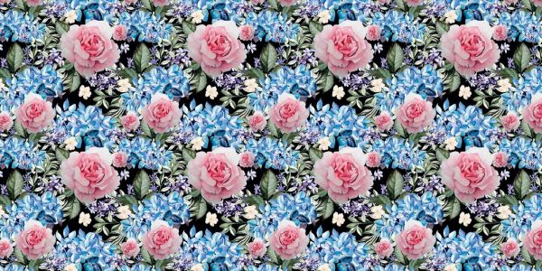 Żywe różowe róże i niebieskie hortensje odgrywają główną rolę w tym projekcie na głębokim czarnym tle. Kwiaty są bogate i szczegółowe, z subtelnymi akcentami dodającymi głębi i tekstury, co nadaje całości romantyczną i marzycielską atmosferę.
