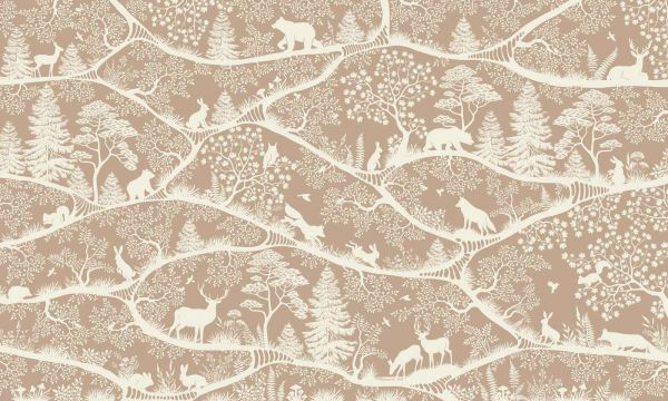 Stylowy i uspokajający leśny motyw z jasnymi sylwetkami jeleni, niedźwiedzi, wilków i królików wśród subtelnych gałęzi drzew i wyrafinowanych roślin. Ciepły beżowy odcień nadaje mu miękki, naturalny i ponadczasowy wygląd.