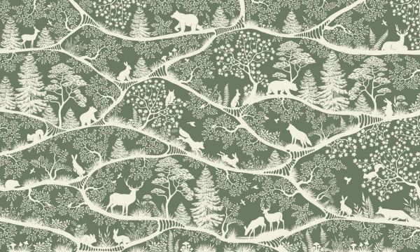 Elegancki deseń leśny z jasnymi sylwetkami jeleni, niedźwiedzi, wilków i królików między zgrabnymi gałęziami drzew i wyrafinowanymi roślinami. Delikatne szałwiowo-zielone tło nadaje naturalny, spokojny i nowoczesny wygląd.