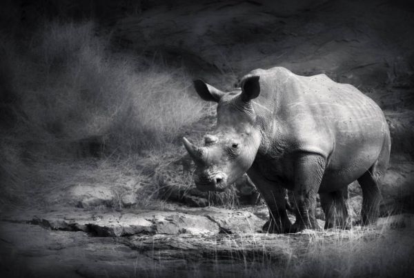 Tapeta z czarno-białym obrazem nosorożca na pustyni.