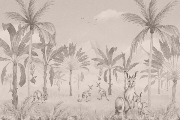 Subtelne przedstawienie kangurów cieszących się cieniem pod kolekcją rozległych palm, wszystko w miękkiej szarej skali, która sugeruje spokój i jedność z naturą.