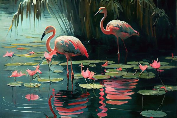 W tej spokojnej oazie flamingi elegancko brodzą między kwitnącymi liliami wodnymi. Subtelne odbicia na spokojnej wodzie i rozrzucone różowe płatki dodają delikatnego piękna tej serene scenie.