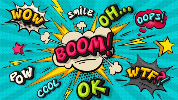Ten żywy projekt przenosi do świata klasycznych komiksów, z chwytliwymi onomatopejami, takimi jak "BOOM!", "WOW!" i "OOPS!" wyświetlanymi na teksturowanym turkusowym tle. Wesołe kolory i zabawna typografia tworzą potężną i młodzieńczą energię.