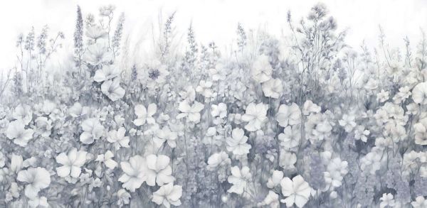 To projekt przedstawia stonowaną łąkę kwiatową w palecie subtelnych odcieni szarości, gdzie liliowe i białe kwiaty znajdują swoje miejsce na miękkim, zamglonym tle. Wyszukane pociągnięcia pędzla tworzą spokojny i marzycielski wygląd, dzięki czemu projekt bez trudu dostosowuje się do różnych stylów wnętrz.