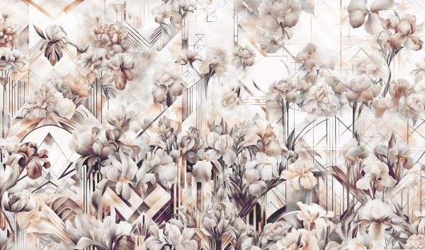 To wspaniały projekt łączy w sobie bujną elegancję kwiatów z symetryczną precyzją stylu Art Deco. Szczegółowe irysy i piwonie kwitną na tle wyrafinowanych geometrycznych wzorów, co tworzy unikalną mieszankę romantyzmu i architektonicznej klasy. Ciepłe odcienie sepia, kremu i złota wprowadzają poczucie vintage luksusu i ponadczasowej finezji.