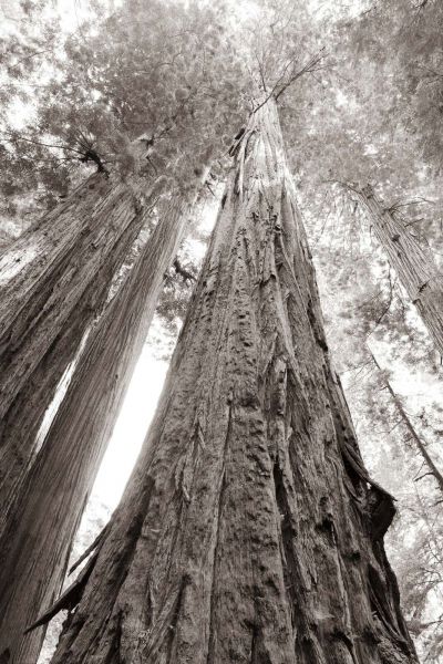 Potężny obraz imponujących drzew olbrzymów, uchwycony z niskiej perspektywy w delikatnych odcieniach sepia i szarości. Pionowe linie i tekstury nadają poczucie wysokości, ciszy i wieczności.