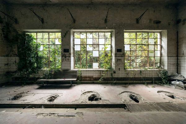 Intrygujący projekt, w którym natura i upadek spotykają się. Zniszczone płytki i zardzewiałe okna pokazują ślady czasu, podczas gdy bluszcz i zieleń powoli przejmują przestrzeń. Miękkie światło wpadające przez stłuczone szyby nadaje tajemniczą i melancholijną atmosferę temu opuszczonemu miejscu.