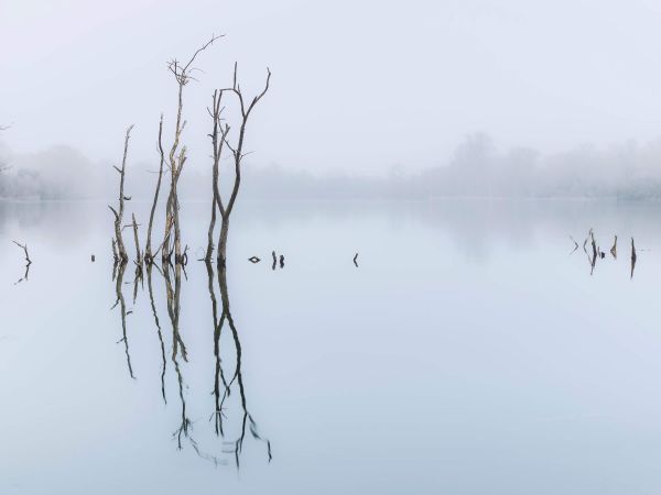 Opuszczone jezioro we mgle. Jezioro wygląda na opuszczone z powodu mgły.
