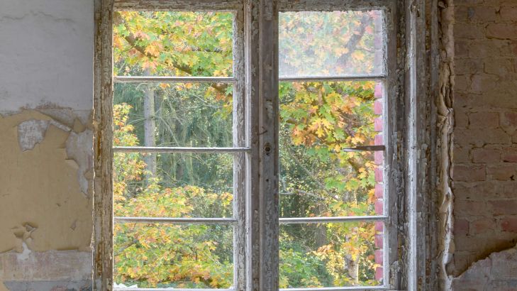 Stary opuszczony pokój z szybą w oknie. Stwórz tajemniczą atmosferę w swoim domu dzięki tej fototapecie.