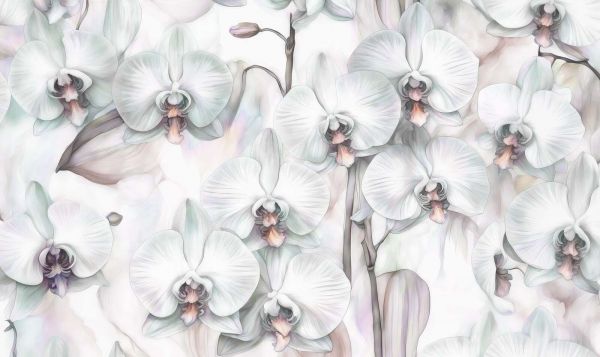 Kontrastująca harmonia między głęboką ciemną zielenią a promiennymi białymi kwiatami nadaje temu projektowi luksusowy i niemal teatralny wygląd. Orchidee wydają się unosić jak cenne klejnoty na ciemnym tle, podczas gdy subtelne, bogate odcienie zieleni w liściach i łodygach dodają dodatkowej głębi. Ten design może być prawdziwą atrakcją w nowoczesnym, minimalistycznym otoczeniu, gdzie intensywność ciemnej zieleni doskonale współgra z prostymi meblami i metalicznymi akcentami. Również w klasycznym lub w stylu art deco wnętrzu wzór dodaje dramatyzmu i wyrafinowania, zwłaszcza gdy połączysz go z aksamitnymi tkaninami i ciemnymi gatunkami drewna. Głębokie odcienie zieleni tworzą poczucie bezpieczeństwa i luksusu, co sprawia, że ten projekt jest idealny na przykład do stylowego salonu lub sypialni głównej. Dzięki wyrafinowanemu oświetleniu i subtelnym złotym lub miedzianym akcesoriom możesz jeszcze bardziej wzmocnić bujną atmosferę, podczas gdy neutralne odcienie utrzymują całość w równowadze.