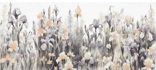 Miękka łąka kwiatowa pełna irysów i narcyzów w kremowych beżowych tonach akwareli. Subtelne, naturalne kolory tworzą przytulną i zapraszającą atmosferę, która sprawdza się wszędzie.