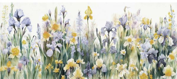 Iskrzące się morze kwiatów z irysami i narcyzami w ciepłych, złotych odcieniach. Jasne akcenty kolorystyczne i delikatna struktura akwareli nadają lekki i radosny nastrój, idealny do wypełnienia każdej przestrzeni słońcem i optymizmem.