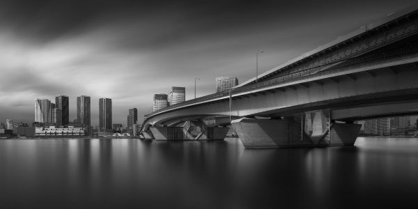 Linia horyzontu z wysokimi biurowcami w czerni i bieli. Po prawej stronie znajduje się most, który wskazuje drogę do miasta.