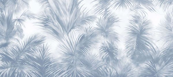 Eleganckie palmowe liście w różnych odcieniach niebieskiego, od delikatnego pastelowego niebieskiego po głęboki granatowy. Tworzy to spokojną, niemal nadmorską atmosferę z tropikalnym akcentem.