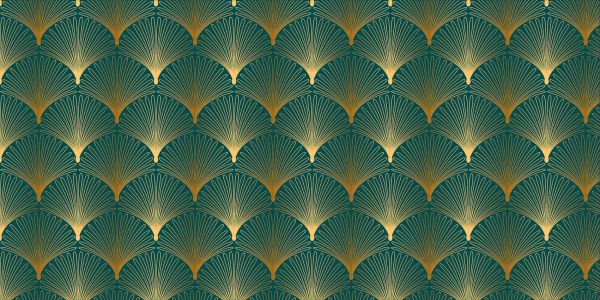 Piękny wzór palmet z wąskimi liniami w kolorze złotym żółtym na turkusowym tle.