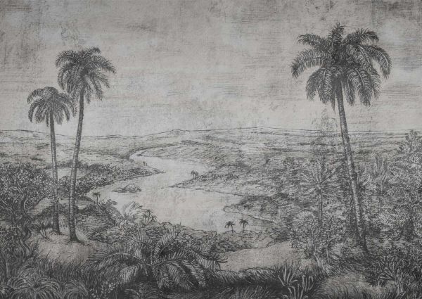 Ten projekt przedstawia klasyczny egzotyczny krajobraz w szczegółowym stylu grawiury, w całości wykonany w czerni i bieli. Dwie wysokie palmy obramowują widok na powoli wijącą się rzekę, która rozciąga się przez pagórkowaty krajobraz. Roślinność jest bogata i zróżnicowana, z tropikalnymi krzewami, strukturami traw i niskimi drzewami, wszystko przedstawione w delikatnych cieniowaniach. Tło subtelnie się rozmywa, co dodaje głębi i spokoju. Lekka tekstura na podłożu nadaje całości wygląd postarzały, jakby wydrukowany na antycznym papierze lub starej ścianie. Ten projekt doskonale pasuje do klasycznego kolonialnego lub nowoczesnego minimalistycznego wnętrza. W klasycznym wnętrzu stanowi nastrojowe tło dla drewnianych mebli, skórzanych foteli i antycznych detali. W minimalistycznym wystroju dodaje charakteru prostym liniom i monochromatycznej palecie kolorów, nie dominując nad nimi. Idealny do bibliotek, korytarzy, domowych biur lub spokojnych kącików mieszkalnych, gdzie dodaje spokojnej i wyrafinowanej atmosfery. Również w środowiskach gastronomicznych lub hotelowych ten projekt oferuje eleganckie odniesienie do podróży odkrywczych i historycznej kartografii. Monochromatyczne wykonanie zapewnia ponadczasowość, podczas gdy botaniczne detale wprowadzają naturalną miękkość. Projekt, który balansuje między dziełem sztuki a dekoracją — subtelny i stylowy.