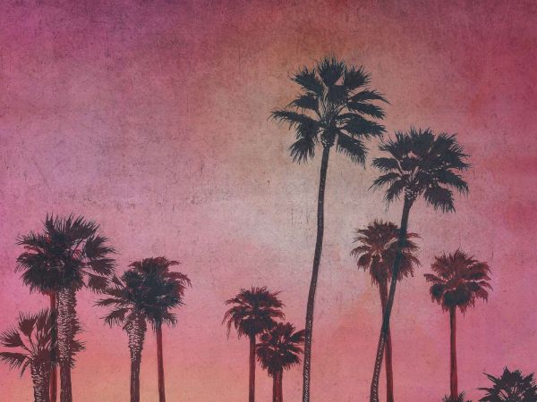 Ciemne palmy elegancko odcinają się na tle nasyconego nieba pełnego różu, fioletu i brzoskwiniowego pomarańczu. Zużyta tekstura i ciepłe kolory przywołują tropikalne, zmysłowe uczucie, które przypomina letnie zachody słońca.