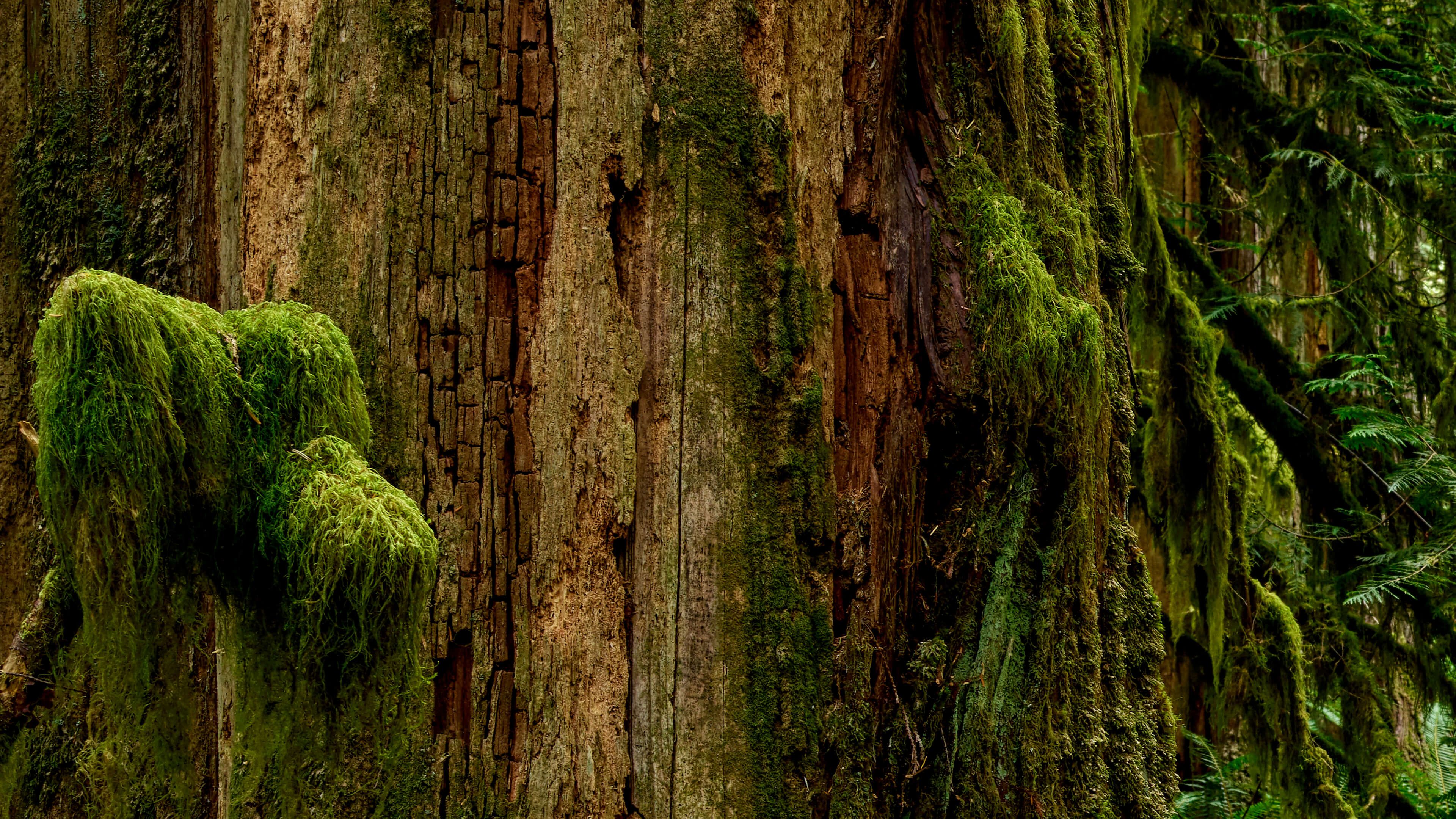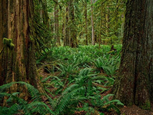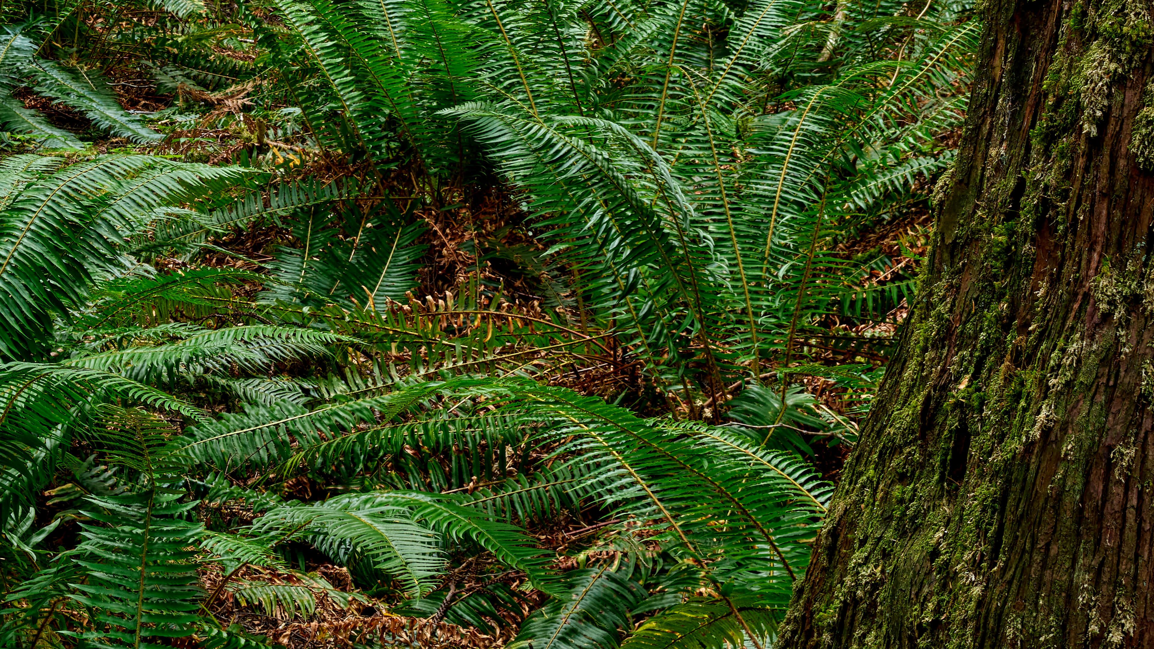 Paprocie pomiędzy dużymi drzewami wyłożonymi mchem.