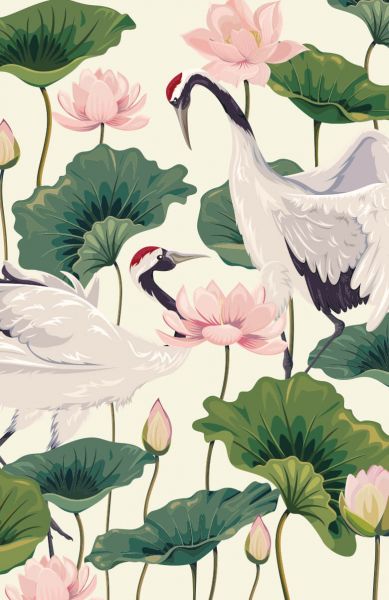 Para żurawi pomiędzy kwiatami lotosu. Połącz tę fototapetę w swojej sypialni lub salonie.