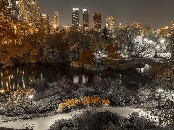 Park w Nowym Jorku nocą. Z tego wzgórza rozciąga się dobry widok na park.