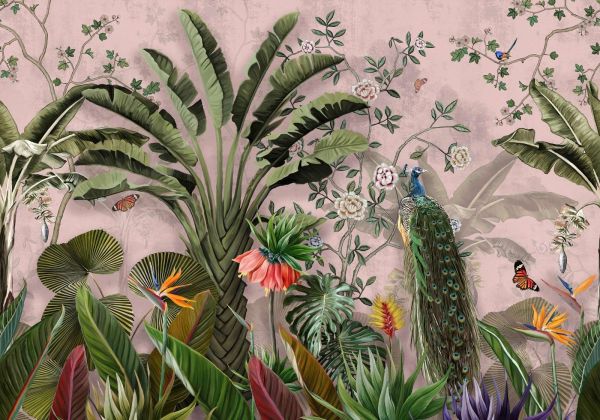 Na tym obrazie paw błyszczy wśród obfitości tropikalnego listowia i kwitnących kwiatów, z tłem, które przynosi kolory natury do wnętrza. Żywa i kolorowa dodatek do każdej przestrzeni.