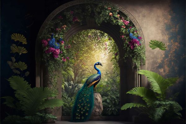 Majestatyczny paw stoi na skale, oprawiony przez kwiatową bramę z widokiem na zaczarowany las. Światło przenikające przez liście nadaje scenie magiczne uczucie.