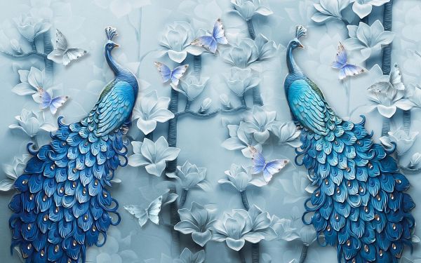 Fototapeta dwóch niebieskich pawi z motylami w tle.