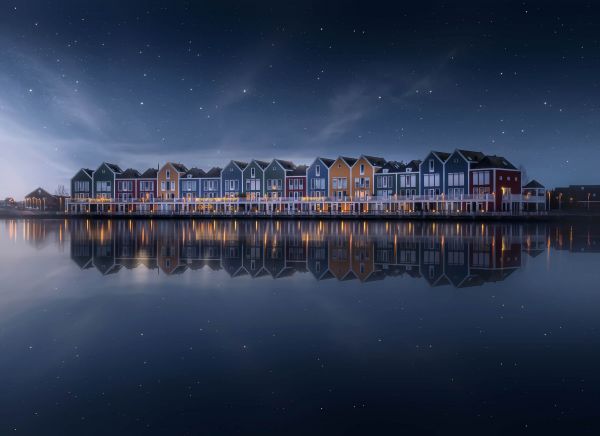 Piękny spokojny wieczór w Holandii z ładnymi kolorowymi domkami nad wodą pod gwiazdami.