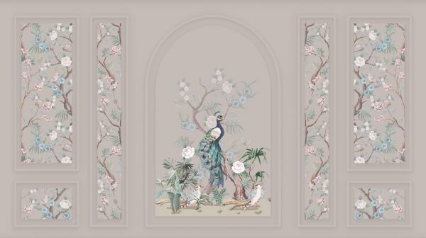 Okazały paw stoi dumnie pośród bogactwa flory, uchwyconej w delikatnych pastelowych odcieniach, które przywołują spokojny, ale arystokratyczny nastrój. Projekt jest odą do naturalnej elegancji.