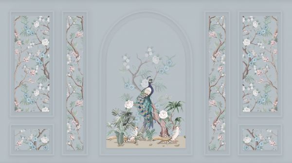 Czarująca scena pięknego pawia otoczonego delikatnymi kwiatami i liśćmi spokojnego ogrodu. Subtelna paleta kolorów podkreśla spokój i pogodę ducha, jakie emanują z tego wzoru.