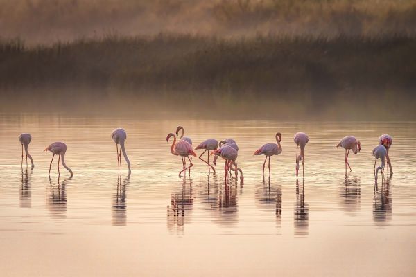Flamingi w jeziorze. Nad jeziorem jest jeszcze trochę mgły.