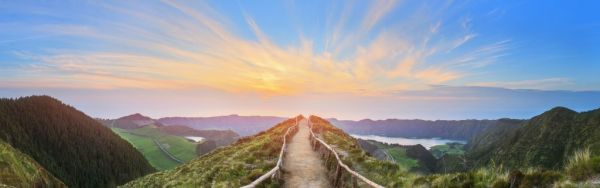 Fototapeta z panoramicznym zdjęciem pięknej trasy spacerowej w górach w Portugalii z widokiem na kilka jezior.