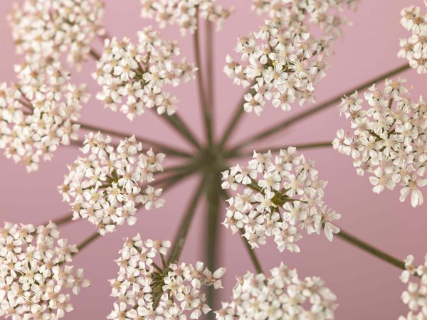 Zbliżenie białej pietruszki krowiej na różowym tle. Idealna tapeta dla miłośników kwiatów.