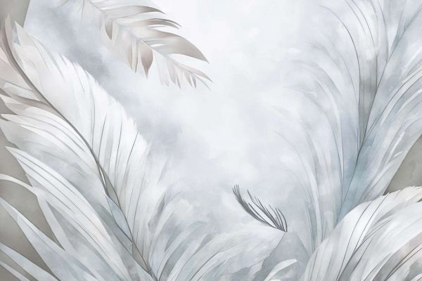 Seren i wyrafinowany projekt z ozdobnymi piórami w chłodnych odcieniach niebieskiego, szarego i delikatnego beżu. Subtelna technika akwarelowa i lekkie przejścia kolorów tworzą marzycielską i uspokajającą atmosferę. Delikatne struktury i organiczne kształty nadają poczucie lekkości i elegancji, idealne do stylowego wystroju wnętrz.