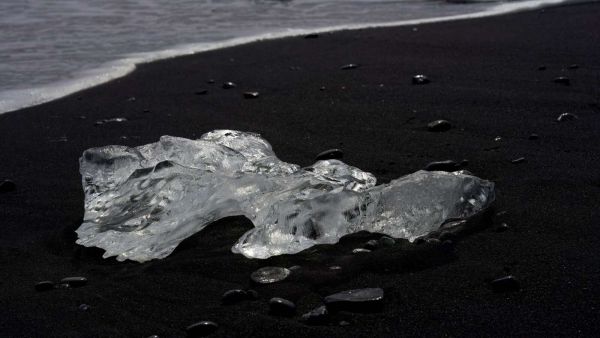 Kryształowo czysty kawałek lodu leży nieruchomo na głęboko czarnej wybrzeżu lawowym, otoczony mokrymi kamieniami żwirowymi. Pianiejące fale w tle podkreślają kontrast między zimnem a wulkanicznym ciepłem.