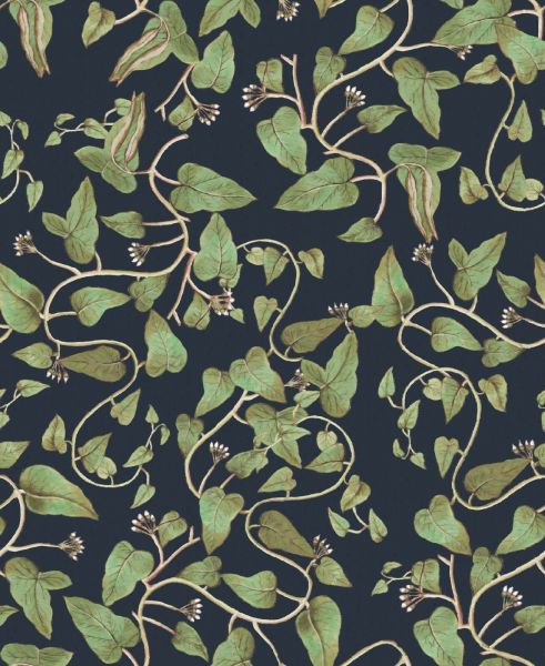 To bogate, botaniczne wzornictwo przedstawia żywe pnącza fasoli, które z naturalną swobodą rozprzestrzeniają się na głębokim nocnym niebieskim tle. Świeżo zielone liście i białe kwiatki są przedstawione z wyrafinowanymi pociągnięciami pędzla, co nadaje ilustracyjny, a jednocześnie realistyczny wygląd. Kontrastujące kolory wzmacniają grę między światłem a cieniem, sprawiając, że wzór wydaje się zarówno dynamiczny, jak i uspokajający.
