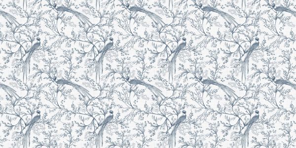 Ten wzór przedstawia delikatny taniec jaskółek unoszący się w eterycznym ogrodzie pełnym delikatnie rozgałęzionych kwiatów. Monochromatyczne niebieskie odcienie na lnianym tle nadają spokojny, ale żywy charakter.