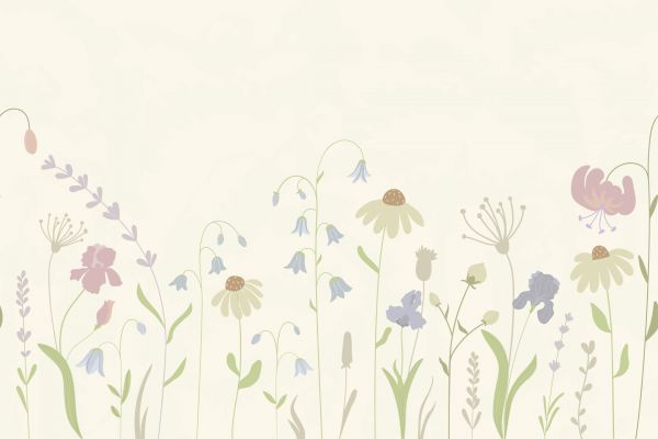 Wysokie pole kwiatowe z różnymi kwiatami. Kolor: beżowy z różnymi kolorami, takimi jak stary róż, zieleń i liliowy.