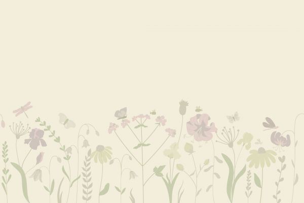 Pole kwiatów z różnymi kwiatami i różnymi owadami, takimi jak motyle i pszczoły. Kolor: Beżowy ze starym różem