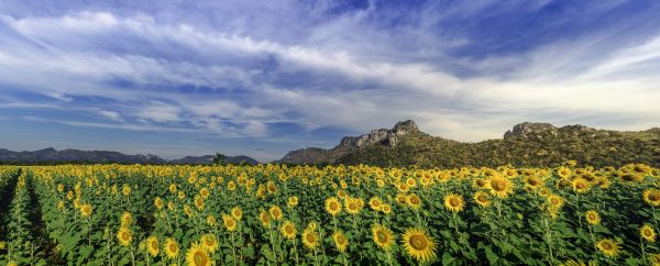 Panoramiczne zdjęcie krajobrazu wypełnionego wszystkimi żółtymi słonecznikami z górami w tle.