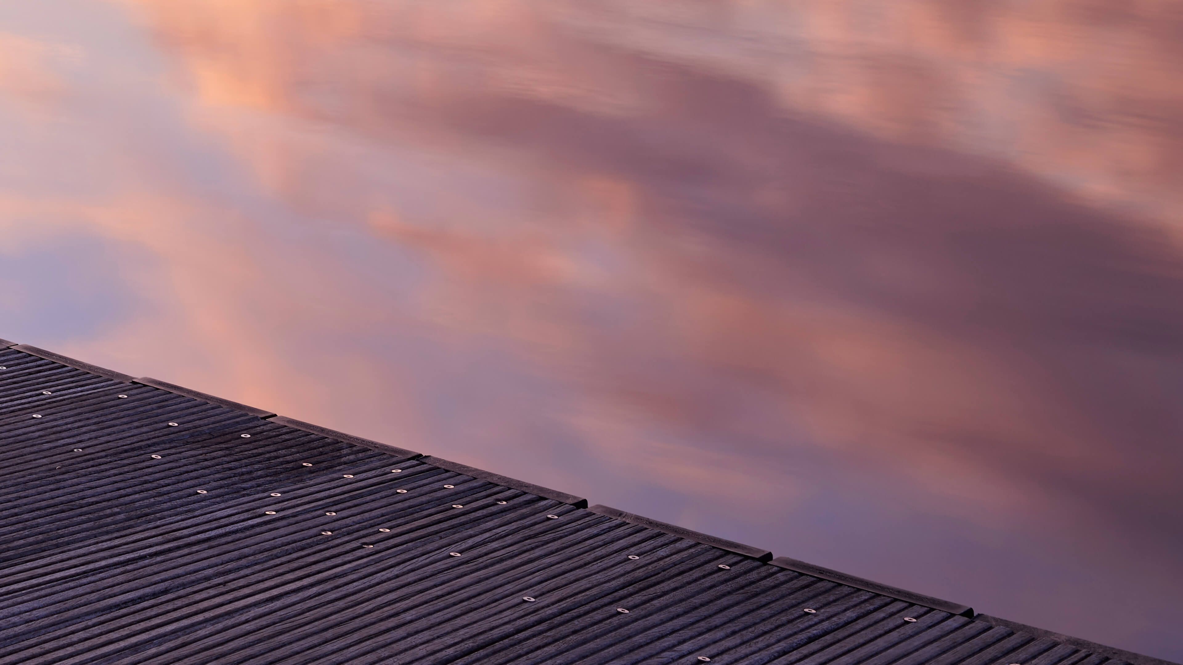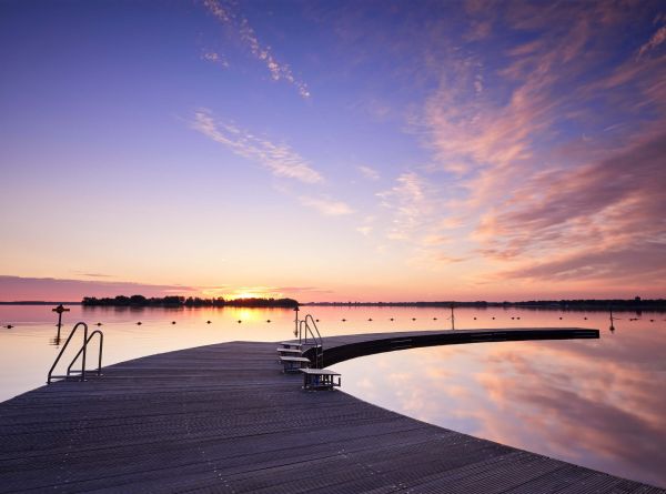Pływające molo z blokami startowymi i pięknym kolorowym niebem o wschodzie słońca.
