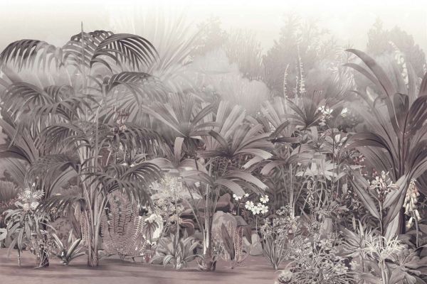Bujne palmy i egzotyczne rośliny ożywają w ciepłych odcieniach sepii i taupe. Styl ilustracji vintage i mglista tło tworzą nostalgiczny i elegancki wygląd dżungli o ponadczasowym charakterze.