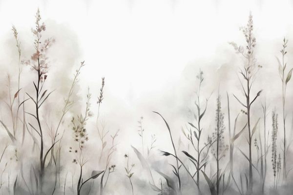 Dziko rosnące trawy i kwiaty w neutralnych odcieniach szarości nadają minimalistyczny i wyrafinowany wygląd. Technika akwarelowa nadaje projektowi delikatną, marzycielską atmosferę, idealną do stonowanego i stylowego wnętrza.