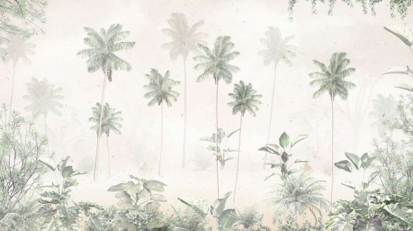 Delikatna paleta pastelowych zieleni i bieli nadaje tej grafice tropikalnego krajobrazu oniryczny wygląd. Lekka mgła wisząca między palmami wzmacnia spokojną i dziewiczą atmosferę tego pokojowego azylu.