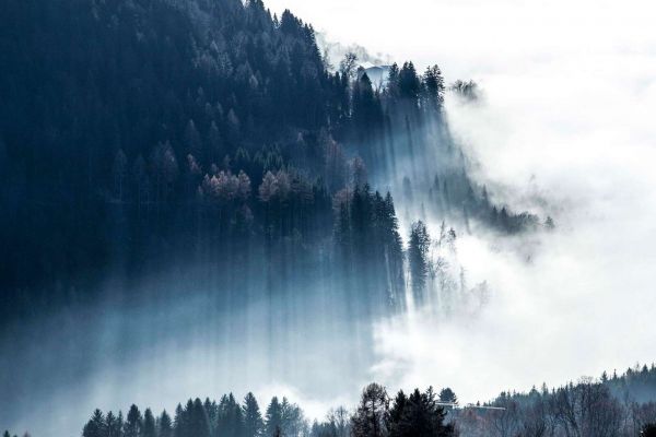 Delikatne, przefiltrowane światło słoneczne rzuca długie promienie przez mglisty las iglasty na zboczu góry. Chłodne odcienie błękitu miesza się z białym światłem mgły, tworząc tajemniczą, spokojną atmosferę.
