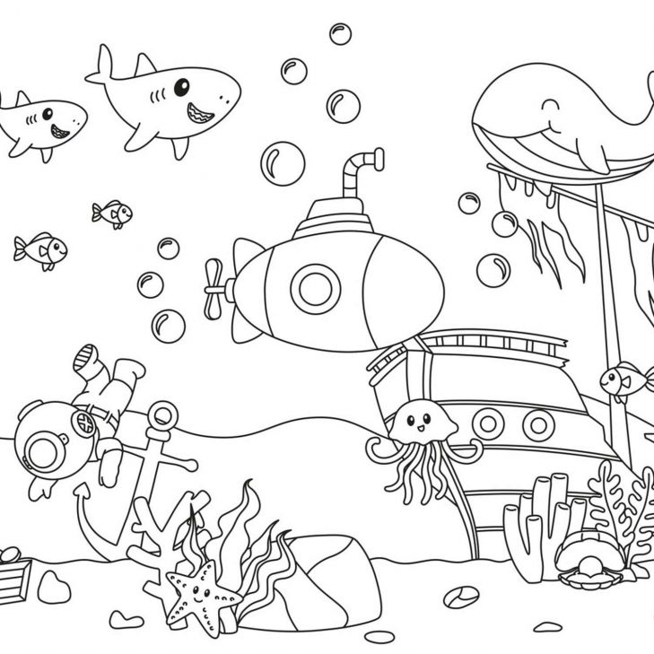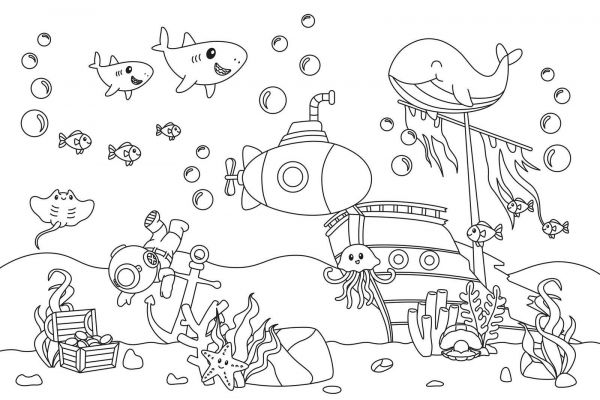 Fantasjogenny podwodny świat pełen ciekawskich morskich stworzeń, zatopiony statek, skrzynia skarbów i nurek na odkryciu. Projekt tętni przygodą, radością i zabawnymi detalami.