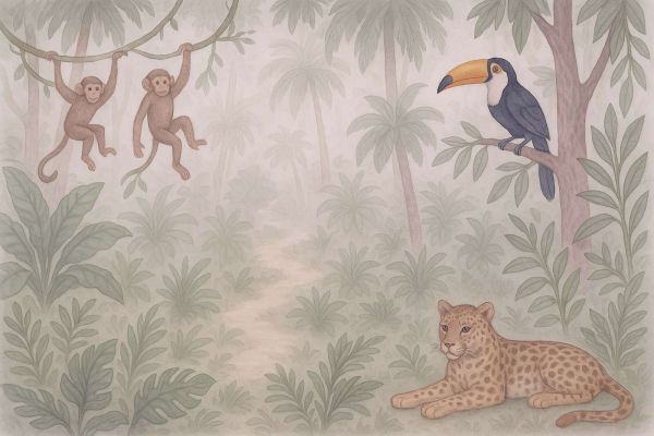 Ta senna scena dżunglowa ożywia spokojny, tropikalny pejzaż, otulony delikatną poranną mgłą. Dwa wesołe małpki beztrosko huśtają się na lianie, podczas gdy młody lampart spokojnie leży w zieleni i obserwuje. Na gałęzi po prawej stronie siedzi tukan z wyrazistym pomarańczowym dziobem, dodając odrobinę koloru do ogólnie spokojnego ustawienia. Dżungla obfituje w bujne liście, palmy i delikatnie wijącą się ścieżkę prowadzącą w głąb. Paleta kolorów składa się z delikatnych odcieni zieleni, ciepłego brązu, piaskowego koloru oraz akcentu w głębokim niebieskim i pomarańczowym dla tukana. Ta kombinacja tworzy spokojny wygląd z odrobiną zabawy. Mglista tło i subtelne przejścia kolorów przyczyniają się do uczucia spokoju, co czyni ten wzór idealnym do sypialni niemowlęcych i dziecięcych. Ten wzór doskonale wpisuje się w botaniczne lub boho wnętrze. Połącz go z meblami z rattanu lub bambusa, dodatkami z naturalnych materiałów, takich jak juta czy bawełna, oraz miękkimi poduszkami w odcieniach takich jak zieleń szałwiowa, beż czy rdza. Puchate pluszowe zwierzątka i drewniane figurki dżungli nadają całości zabawny i przyjemny charakter. Idealny do zastosowania za kołyską lub łóżeczkiem, lub jako spokojne tło dla kącika do czytania. Ten wzór zachęca do twórczych opowieści i odkryć, nie przytłaczając. Kompozycja jest lekka i przestrzenna, co sprawia, że doskonale sprawdza się także w mniejszych pomieszczeniach.