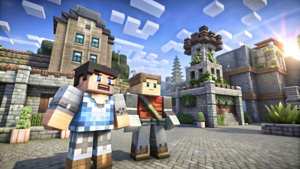 Ciche i klimatyczne miasteczko pikselowe z szczegółowymi kamiennymi budynkami i zielonymi akcentami. Dwie postacie pikselowe stoją w centrum, gotowe na nowe odkrycia. Jasne niebo i delikatne promienie słońca nadają całości ciepły, spokojny wygląd.